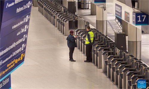 A cleaner works near empty ticket barriers at Waterloo Station in London on August 18, 2022 as Britain's train network faces further heavy disruption in major walkouts that follow the sector's biggest strike action for 30 years already this summer. Photo: VCG