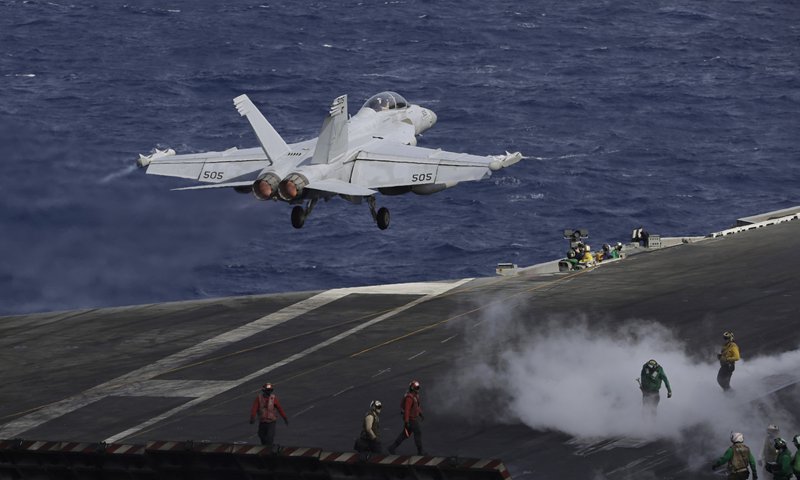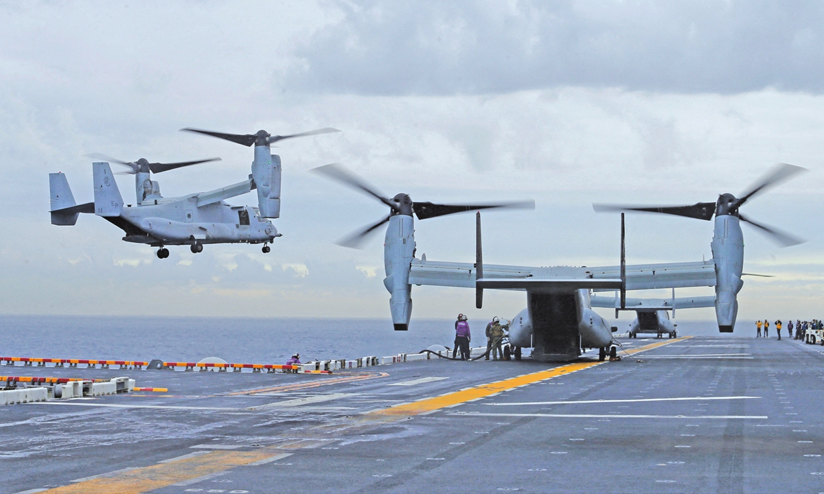 US aircraft land on the deck of the USS Bonhomme Richard amphibious assault ship during a joint military exercise between the US and Australia, off the coast of Sydney on June 29, 2017. Photo: VCG