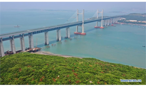 Aerial photo taken on Nov. 30, 2021 shows the main bridge of the Quanzhou Bay cross-sea bridge of the Fuzhou-Xiamen high-speed railway in southeast China's Fujian Province.(Photo: Xinhua)