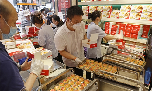 Staff pack fresh meat-filled mooncakes into boxes at a shop in Shanghai on September 6, 2022. The Mid-Autumn ...