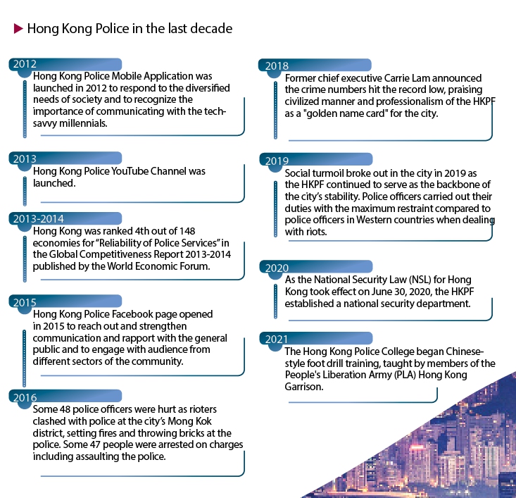 Over the last 10 years, not only has the Chinese mainland witnessed tremendous changes and progress but also one of its Special Administrative Regions (SAR) has emerged from the chaos and social turbulence, embracing restored social stability with a promising future under the National Security Law (NSL) for Hong Kong and the electoral system reform. The Hong Kong Police Force (HKPF) - the backbone of safeguarding the city's order and rule of law, has always been at the frontline of witnessing such changes.