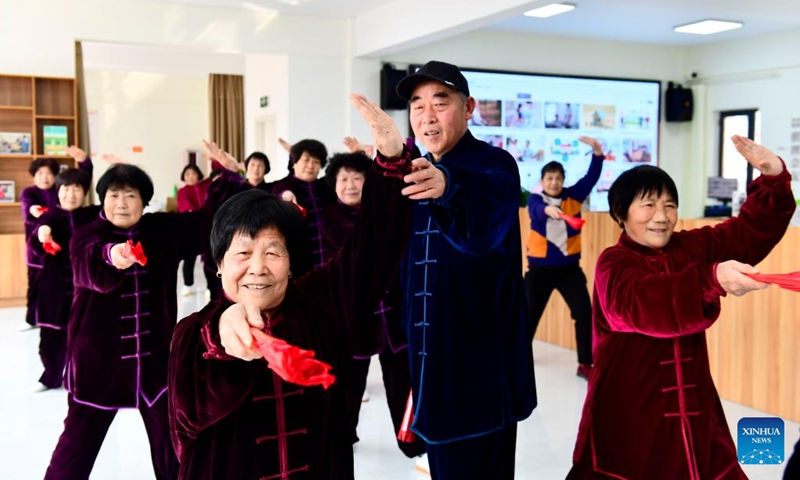Elderly people practice Taiji at a community care center for the elderly in Lanshan District, Rizhao, east China's Shandong Province, Feb. 27, 2022. Lanshan District of Rizhao City has set up care centers since 2021, providing assistance and care to the elderly people over 60 years old.(Photo: Xinhua)
