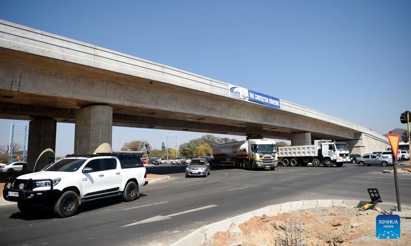 Vehicles run underneath the bridge of a China-built rainbow intersection in Gaborone, Botswana, Sept. 9, 2022. (Photo by Tshekiso Tebalo/Xinhua)