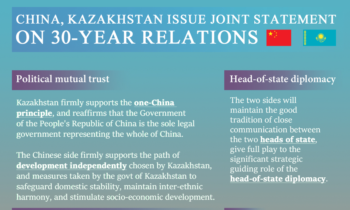Kazakhstan is where Xi first proposed the Belt and Road Initiatve (BRI) back in 2013. Kazakhstan's leadership is positive about the results of cooperation under the BRI. The China-proposed initiative coincides with Kazakhstan's industrialization program, Nurly Zhol (Bright Path). The cornerstones of this infrastructure program is a list of over 50 priority projects of bilateral industrial-investment cooperation, and in this regard, the BRI has become an "anchor" for Kazakhstan's policy implementation.