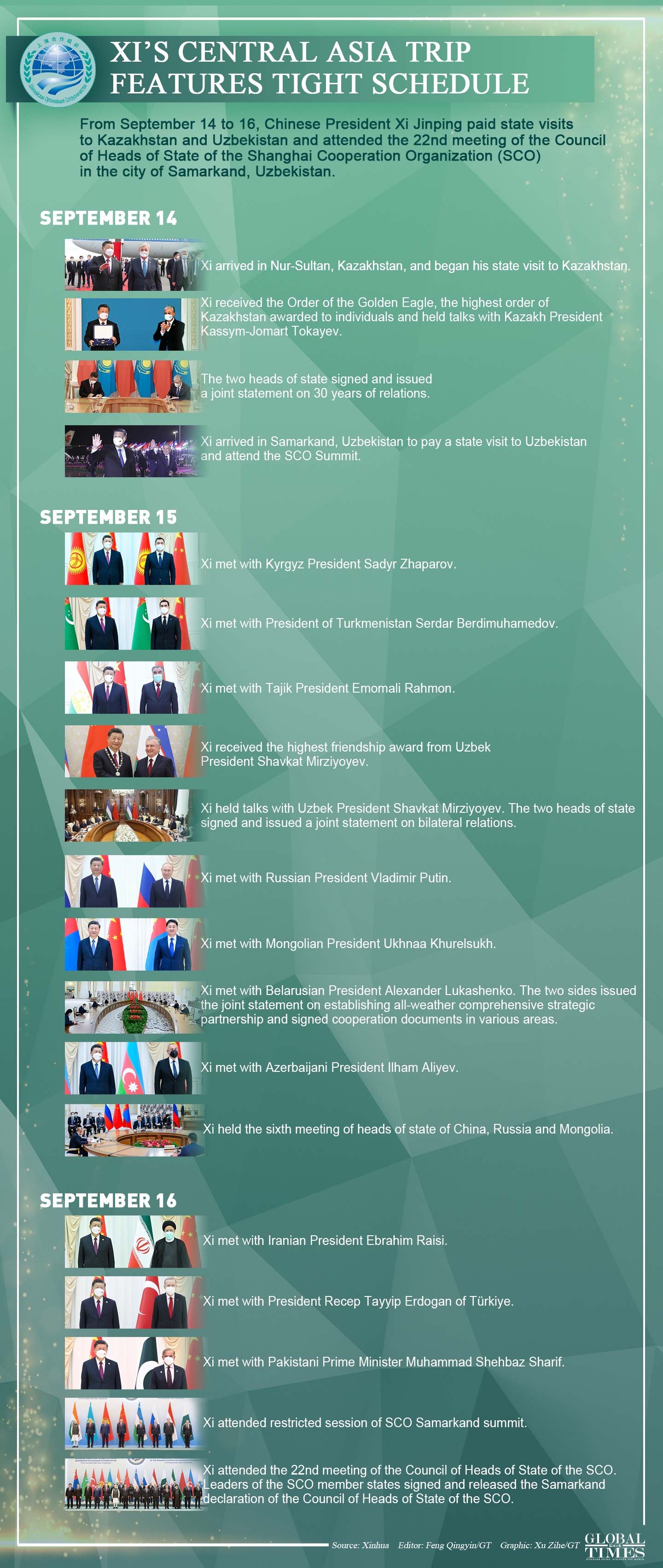 Chinese President Xi Jinping’s Central Asia trip featured a tight schedule, during which Xi paid state visits to Kazakhstan and Uzbekistan and met with 12 world leaders and attended the SCO summit. Editor: Feng Qingyin/GT Graphic: Xu Zihe/GT