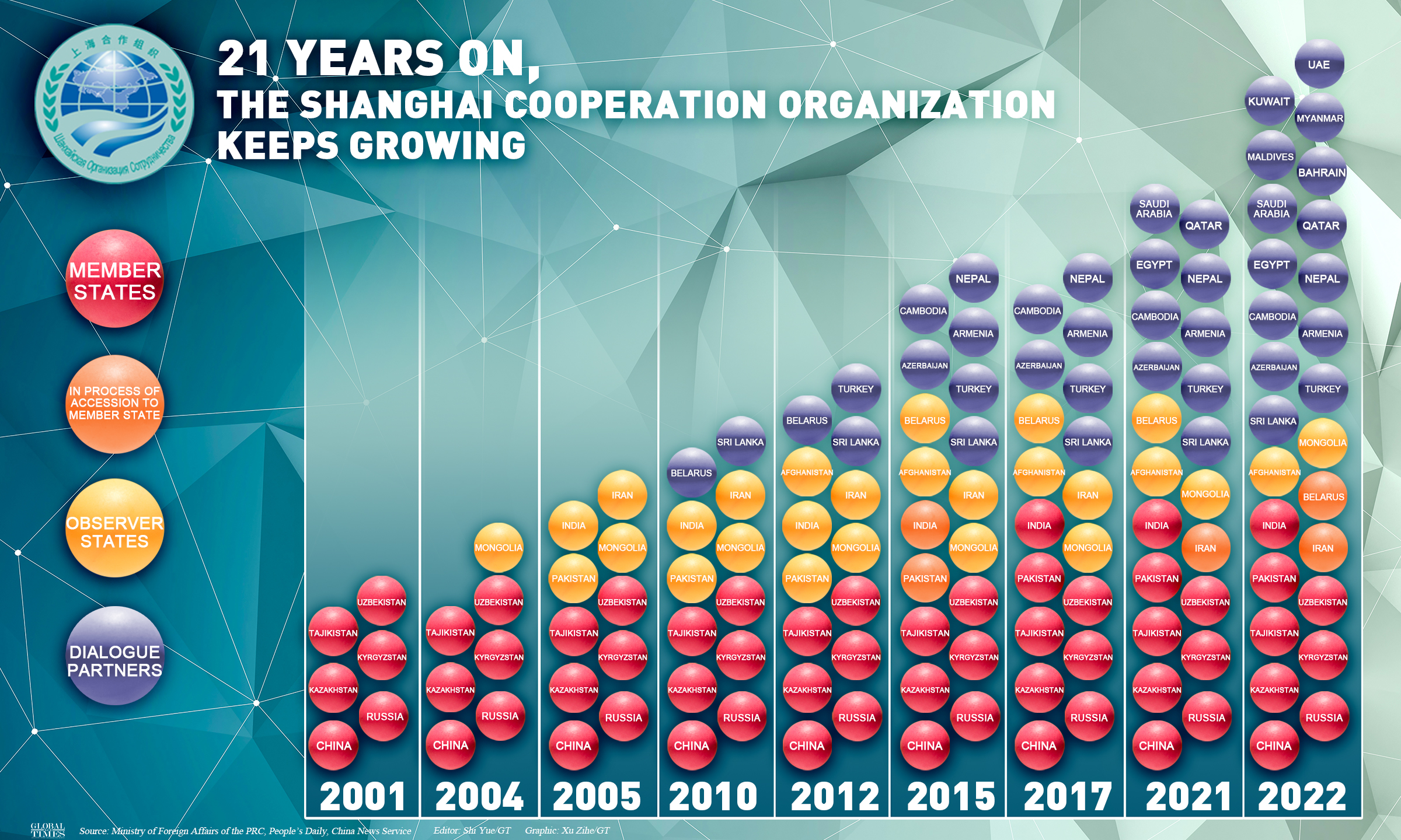 Zhu Yongbiao, executive director of the Research Center for the Belt and Road and director of the Center for Afghanistan Studies at Lanzhou University, told the Global Times on Friday that the fruitful contents of the Samarkand Declaration showed that the SCO is marching toward becoming a more international organization from a regional organization, while its membership expands along with the member states' issues of interest.