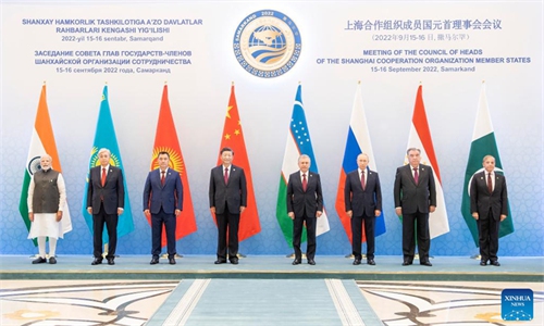 Chinese President Xi Jinping (seventh from left, front) and leaders of other Shanghai Cooperation Organization (SCO) member states, observer states and dialogue partners pose for a photo before the 22nd meeting of the Council of Heads of State of the SCO on September 16, 2022, in Samarkand, Uzbekistan. Photo: Xinhua