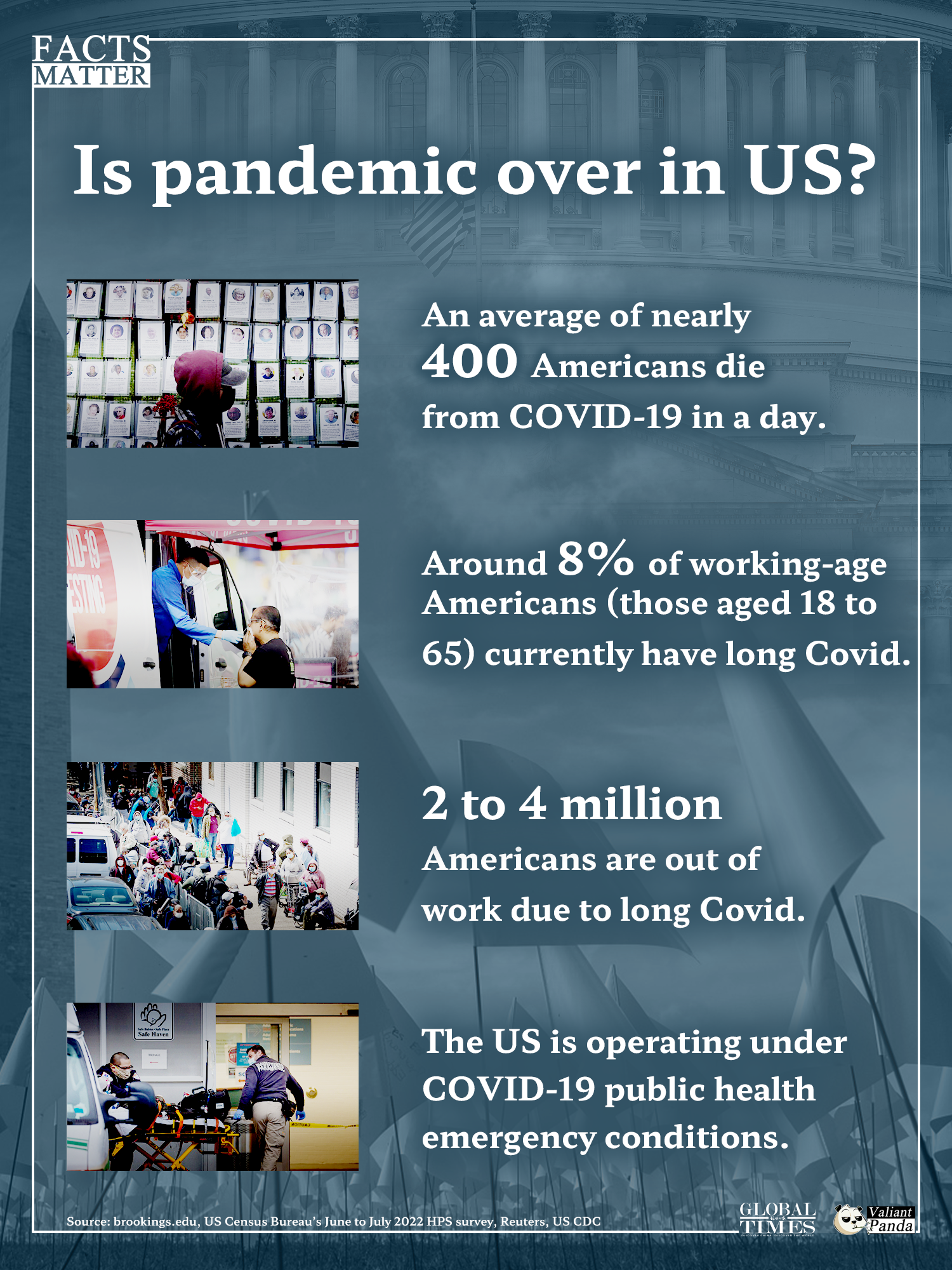 Chen Xi, an assistant professor of public health at Yale University, told the Global Times on Tuesday that the pandemic in the US is not over, as an average of some 400 people die of COVID-19 every day and about 30,000 COVID-19 patients are hospitalized currently in the country.