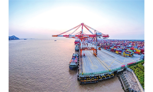 Aerial photo taken on July 29, 2022 shows container ships at the Qianwan Container Terminal in Qingdao Port, east China's Shandong Province. Photo:Xinhua