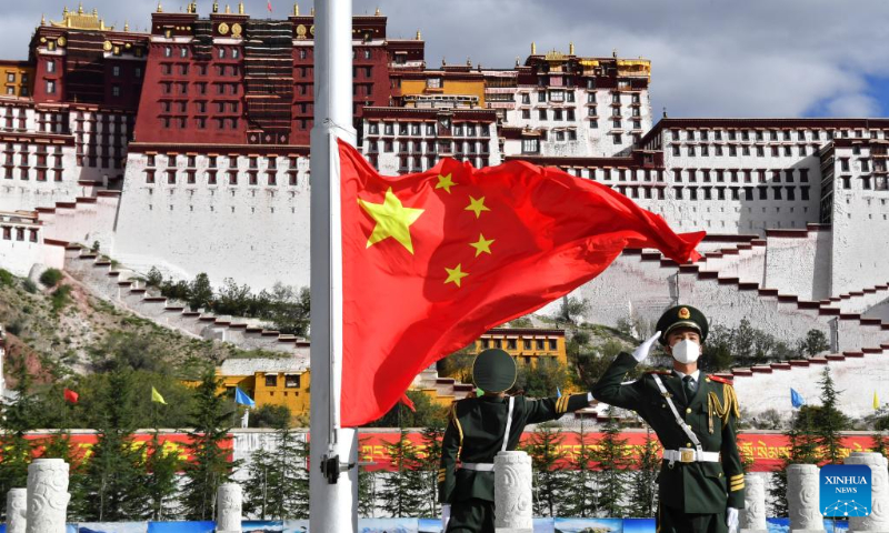 A flag-raising ceremony is held to celebrate the 73rd anniversary of the founding of the People's Republic of China at the Potala Palace square in Lhasa, capital of southwest China's Tibet Autonomous Region, Oct. 1, 2022. (Xinhua/Chogo)