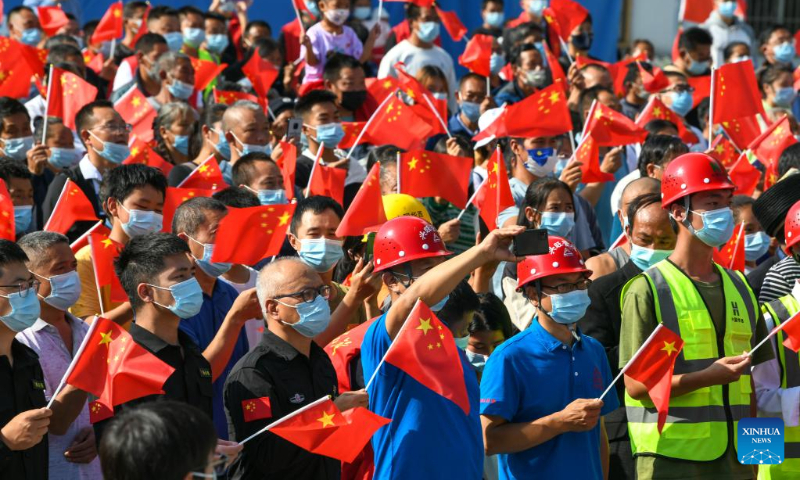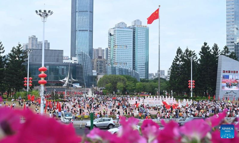 People gather at a square to celebrate the 73rd anniversary of the founding of the People's Republic of China in Fuzhou, southeast China's Fujian Province, Oct. 1, 2022. (Xinhua/Lin Shanchuan)