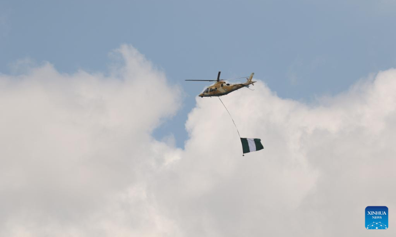 A helicopter carries a Nigerian national flag during celebrations marking Nigeria's Independence Day in Abuja, Nigeria, Oct. 1, 2022. (Photo by Emma Houston/Xinhua)