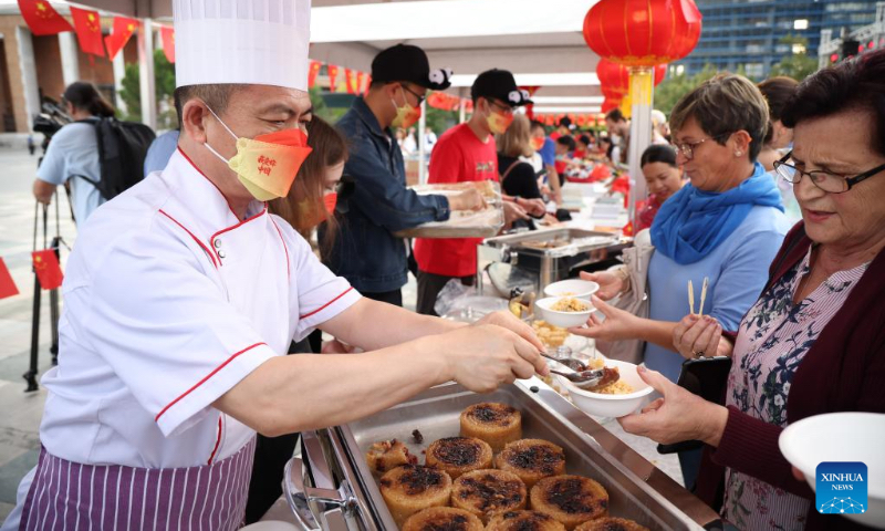 People try Chinese food during the Chinese Culture Week 2022 in Tirana, Albania, Sept. 30, 2022. A series of Chinese cultural activities have been held in Albania's capital city Tirana since Sept. 26, including a Chinese culture-themed gala at the city center Friday evening. (Photo by Gent Onuzi/Xinhua)