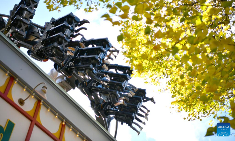 People take a roller coaster at an amusement park in Stockholm, Sweden, Oct. 8, 2022. (Xinhua/Ren Pengfei)