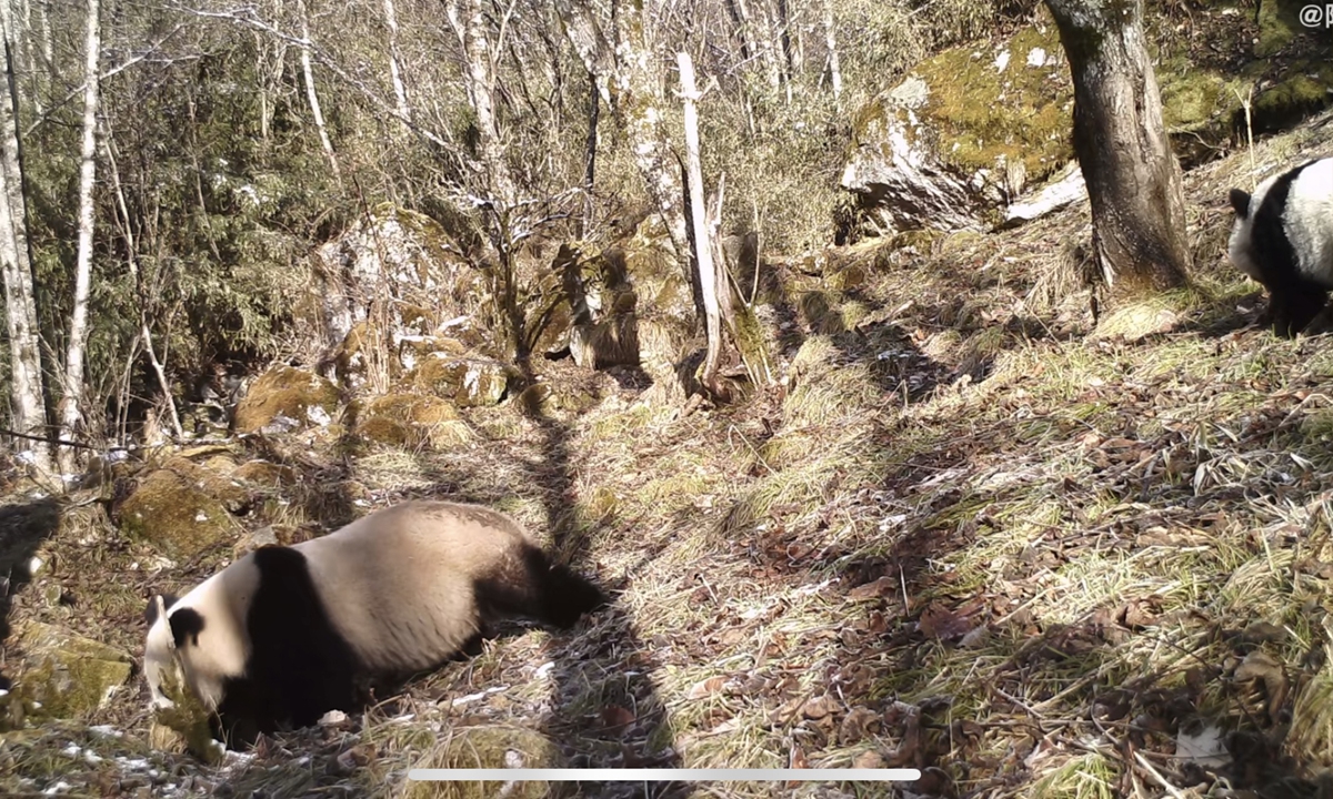 A rare picture of two wild pandas,a mother and its baby, hanging out together in a nature reserve in Northwest China's Shaanxi Province, has been captured by an infrared camera. Photo: Bailu Video