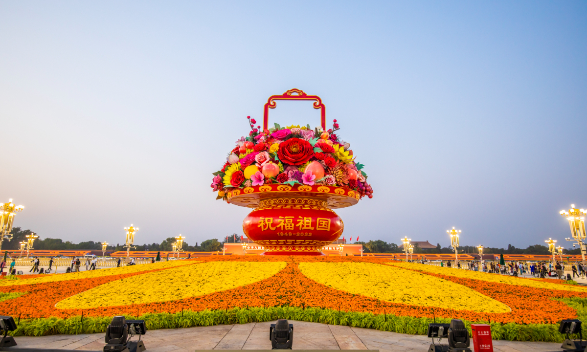 A huge artificial flower basket decorates Tian'anmen Square during 2022 National Day holidays. Photo: VCG