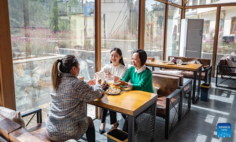 Visitors take a rest at a bar in Longchi Village in Wuxi County, southwest China's Chongqing, Oct. 13, 2022.Photo:Xinhua