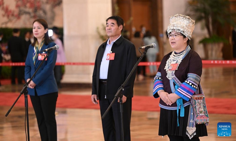 Delegates to the 20th National Congress of the Communist Party of China (CPC) Jiang Lijuan, Sun Jinlong and Yu Ruofei (from L to R), attend an interview at the Great Hall of the People in Beijing, capital of China, Oct. 16, 2022.Photo:Xinhua