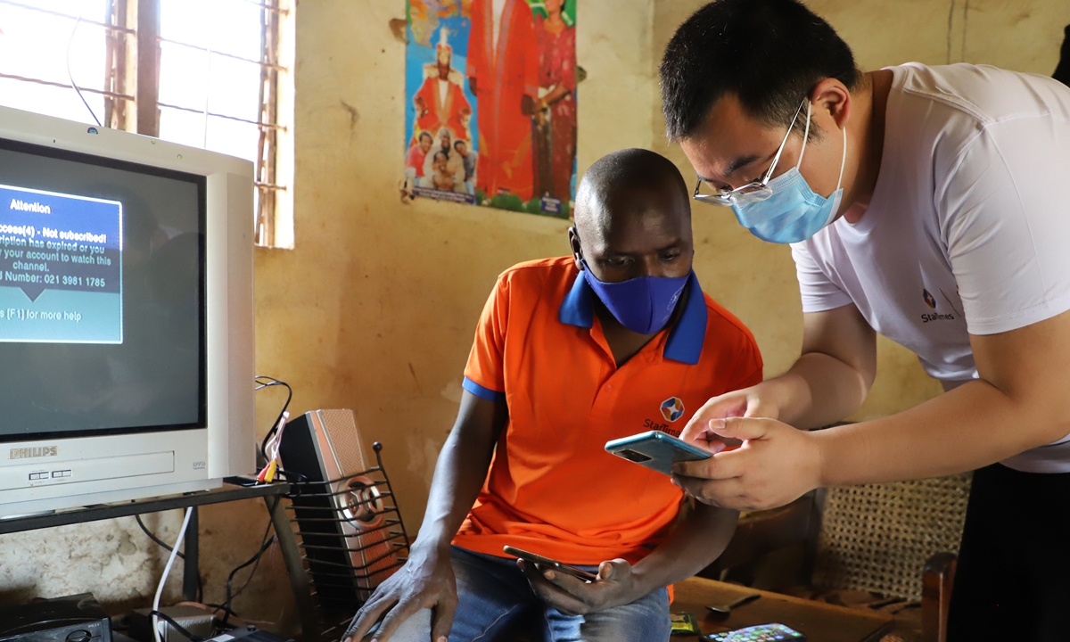 A technician helps adjust a satellite TV in Uganda. File photo: Xinhua