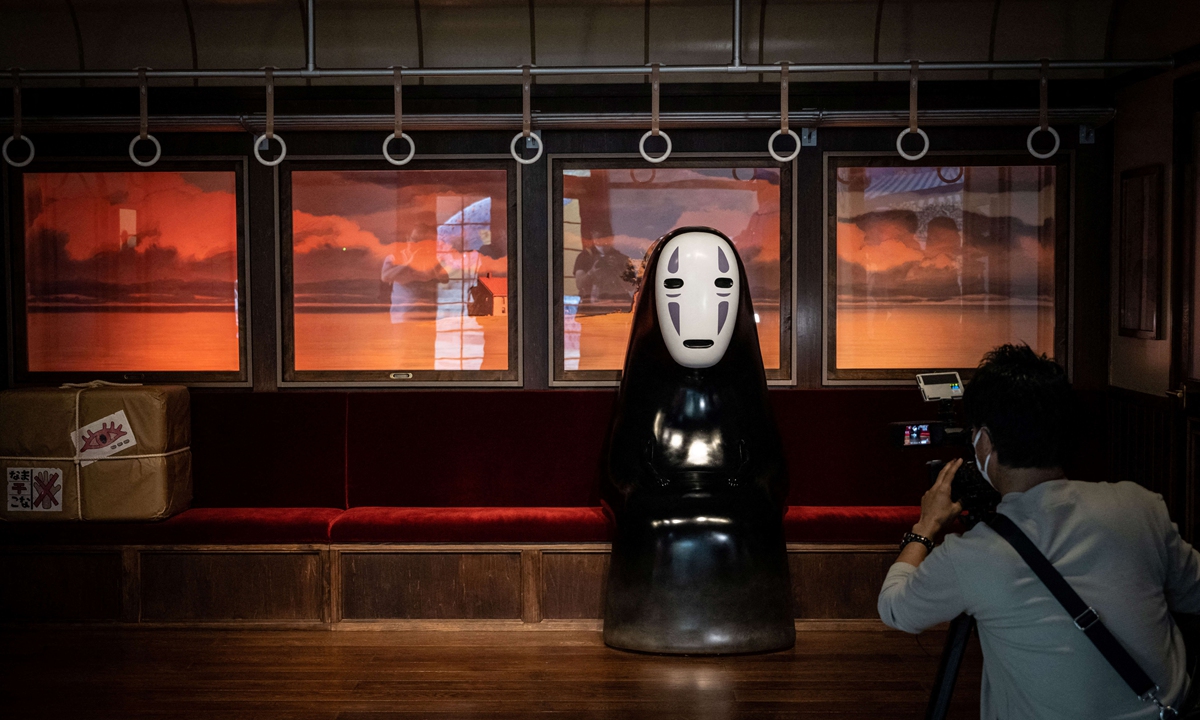 Visitors can stroll along an alley designed to look like the opening scene of "Spirited Away," or perch on the red velvet-covered train seat in a carriage next to the movie's instantly recognizable "No-Face" character.