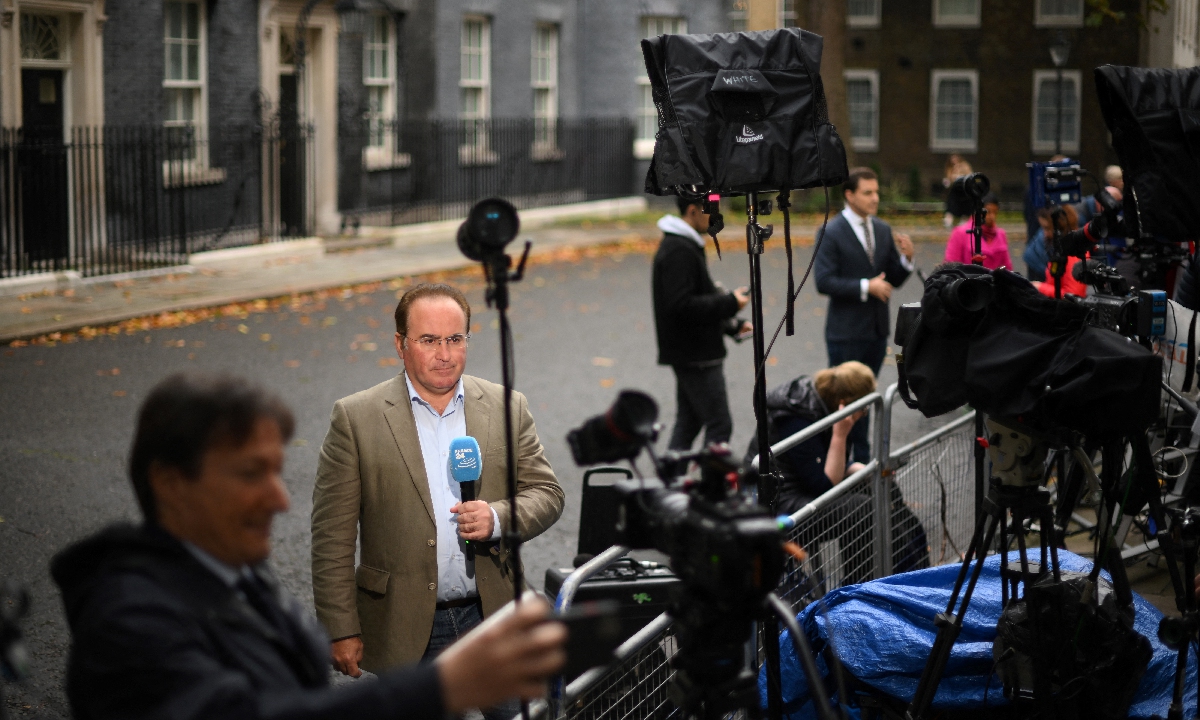 Journalists report from outside 10 Downing Street in central London on October 21, 2022. Contenders bidding to succeed Prime Minister Liz Truss canvassed for support with her predecessor Boris Johnson, who is reportedly considering a sensational comeback, while opposition parties demanded an early general election to end months of political chaos. Photo: AFP