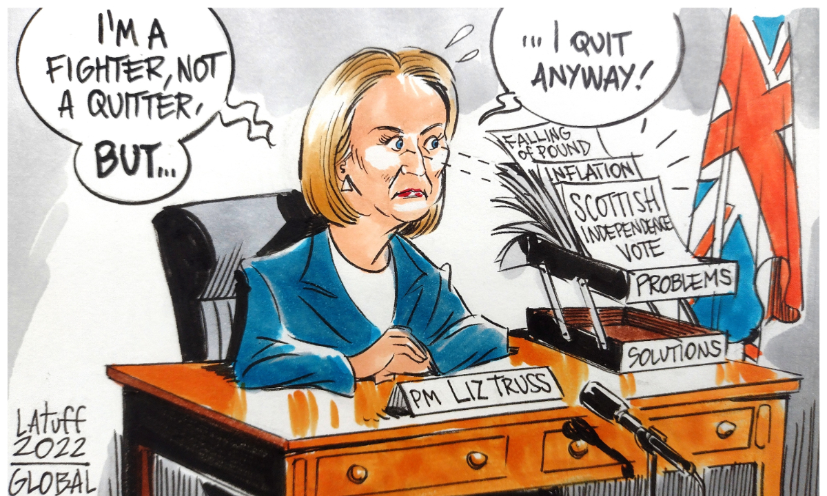 Liz Truss's final U-turn. Cartoon: Carlos Latuff