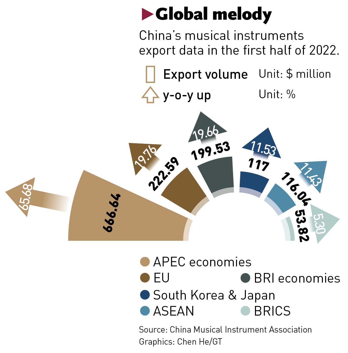 In the first half of the year, China's musical instrument export to Association of Southeast Asian Nations came in at $116 million, up 10.48 percent year-on-year. The export value to APEC economies was up 4.08 percent to $667 million while the export to countries and regions along the Belt and Road Initiative mounted to $200 million, up by 2.32 percent.