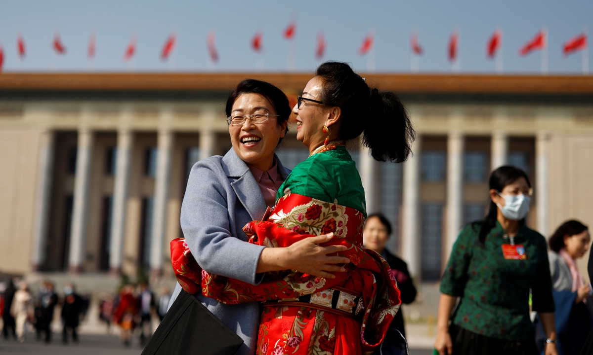 Delegates embrace outside the Great Hall of the People to celebrate the International Women's Day after the second plenary meeting of the fifth session of the 13th National People's Congress in Beijing on March 8, 2022.