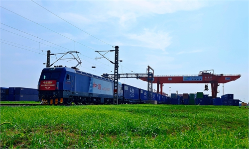 A China-Europe freight train arrives at Xi'an international port in Xi'an, northwest China's Shaanxi Province, Aug. 31, 2022. The freight train loaded with raw materials of liquorice, a Chinese medicinal herb, which departed from Turkmenistan, arrived at the Xi'an international port in Shaanxi Province on Wednesday.(Photo: Xinhua)