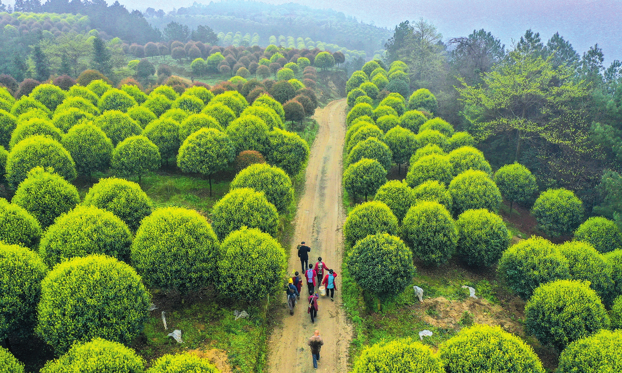 Villagers walk home after planting trees in Changxing Forestry Farm in Zigong, Southwest China's Sichuan Province, on March 11, 2021. Photo: VCG