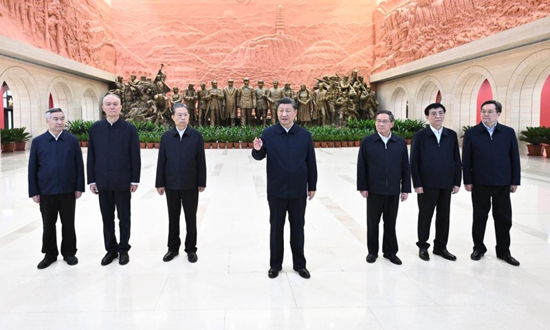 Xi Jinping visits an exhibition on the 13 years of the Communist Party of China (CPC) Central Committee in Yan'an at the Yan'an Revolutionary Memorial Hall in Yan'an, northwest China's Shaanxi Province, Oct. 27, 2022. Xi Jinping, general secretary of the CPC Central Committee, led members of the Standing Committee of the CPC Central Committee Political Bureau on Thursday to visit Yan'an, an old revolutionary base in northwest China's Shaanxi Province. Xi, also Chinese president and chairman of the Central Military Commission, was accompanied by Li Qiang, Zhao Leji, Wang Huning, Cai Qi, Ding Xuexiang and Li Xi. Photo:Xinhua