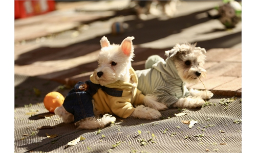 Dogs wear winter clothes and go out to play as the weather turns cool in Shenyang, Northeast China’s ...