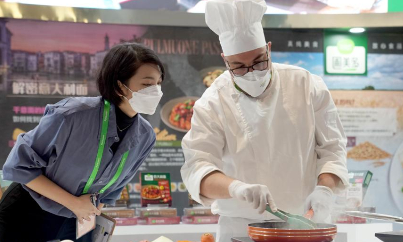 A chef cooks at the Food and Agricultural Products exhibition area of the fifth China International Import Expo (CIIE) at the National Exhibition and Convention Center (Shanghai) in east China's Shanghai, Nov. 5, 2022. The fifth CIIE is scheduled on Nov. 5-10 in China's economic hub Shanghai. Photo: Xinhua