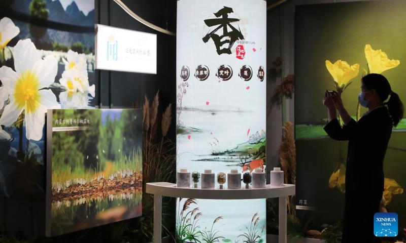 A visitor takes photos at China's Achievement Exhibition for the 30th Anniversary of Accession to the Ramsar Convention on Wetlands, in Wuhan, central China's Hubei Province, Nov. 6, 2022. The achievement exhibition kicked off here on Sunday. (Xinhua/Yao Qilin)