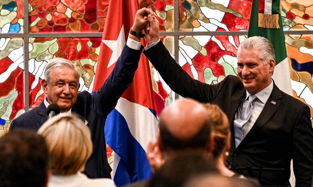 Cuban President Miguel Diaz Canel and his Mexican counterpart Andrés Manuel López Obrador raise their hands before signing bilateral agreements in Havana on May 8, 2022. Photo: VCG