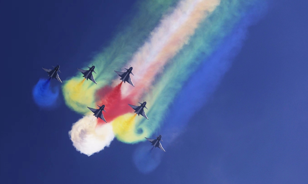 Six J-10 fighter jets of the August 1 Aerobatic Team paint the sky with beautiful colors in a flight performance. Photo: Cui Meng/GT