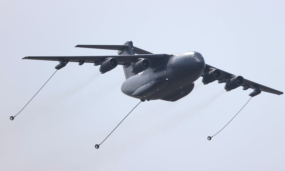 It was also the first time that China's latest aerial tanker, the YU-20, developed based on the country's own Y-20 large transport aircraft, delivered an aerial display during a public event. It for the first time released all three of its aerial refueling baskets, and as the bulky but flexible aircraft maneuvered in the sky, it was like three ponytails danced with it.