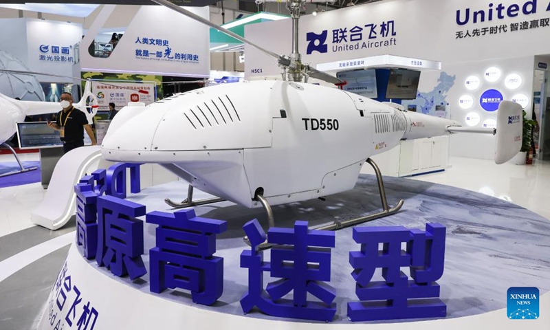 This photo taken on Nov. 8, 2022 shows a TD550 unmanned helicopter displayed at the 14th China International Aviation and Aerospace Exhibition, also known as Airshow China, in the port city of Zhuhai, south China's Guangdong Province. A range of China's homegrown unmanned aerial vehicles (UAVs) and anti-drone system are showcased at the 14th Airshow China.(Photo: Xinhua)