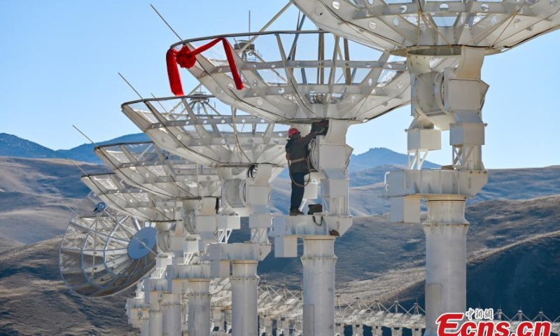 A technician works on an antennas of the Solar Radio Telescope in Daocheng county, Ganzi Tibetan Autonomous Prefecture, southwest China's Sichuan Province, Nov. 13, 2022. Photo: China News Service