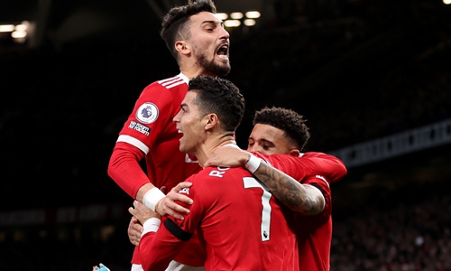 Cristiano Ronaldo of Manchester United reacts during the Premier League match between Brentford FC and Manchester United at Brentford Community Stadium in Brentford, the UK on August 13, 2022. Photo: VCG