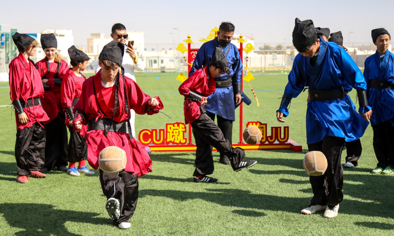 China-Qatar Youth Soccer Exchange and Experience Activity is held at the FIFA Fan Festival inside Al Bidda Park in Doha, Qatar on November 21, 2022, where young players are seen wearing traditional cuju clothes. Photo: Courtesy of Network of International Cultural-link Entities
