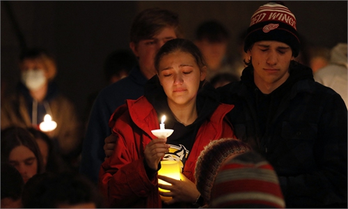 Ren Kurgis (L) and Jessie Pacheco (R) pay their respects to the victims of the mass shooting at Club Q, an LGBTQ nightclub, in Colorado Springs, Colorado, on November 20, 2022. At least five people were killed and 18 wounded in a mass shooting at an LGBTQ nightclub in the US city of Colorado Springs, police said on November 20, 2022. Photo: VCG
