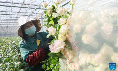 Workers pack newly picked roses at a greenhouse in Xiajia village, East China's Shandong Province, on November 23, 2022. The daily output of roses exceeds 100,000 plants. Xiajia village has about 15,000 mu (1,000 hectares) of flower planting bases, including rose, gerbera and lily sections. Photo: VCG