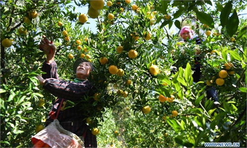 Workers check fresh navel oranges for shipment on an intelligent sorting and packaging line in Ganzhou, East China’s Jiangxi Province, on November 28, 2022. Ganzhou’s navel orange production is expected to reach 1.5 million tons this year, and many local farmers have increased their incomes by growing oranges. Photo: VCG