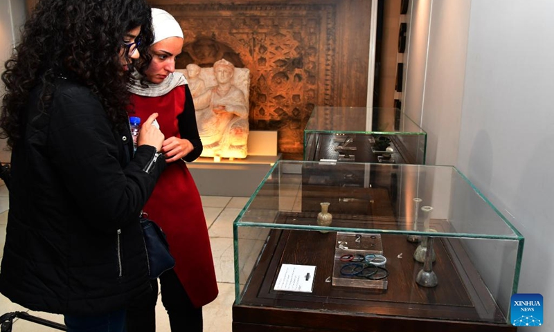 Visitors look at retrieved artifacts at the Syrian national museum in Damascus, Syria, on Nov. 24, 2022. Around 35,000 stolen Syrian artifacts have been retrieved by the authorities since the beginning of the 11-year war in Syria, an antiquities official told Xinhua on Sunday.(Photo: Xinhua)