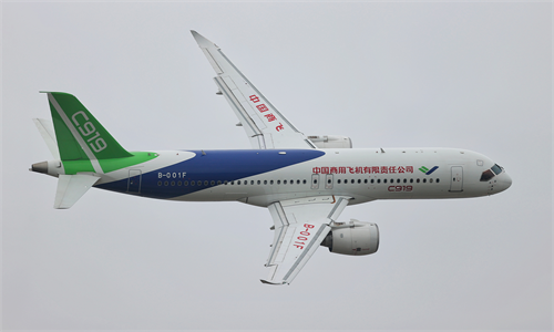 A C919 jet takes part in a flying display at the 14th Airshow China in Zhuhai, South China's Guangdong Province, on November 9, 2022. The C919 has received 300 new orders during the airshow. Photo: Cui Meng/GT