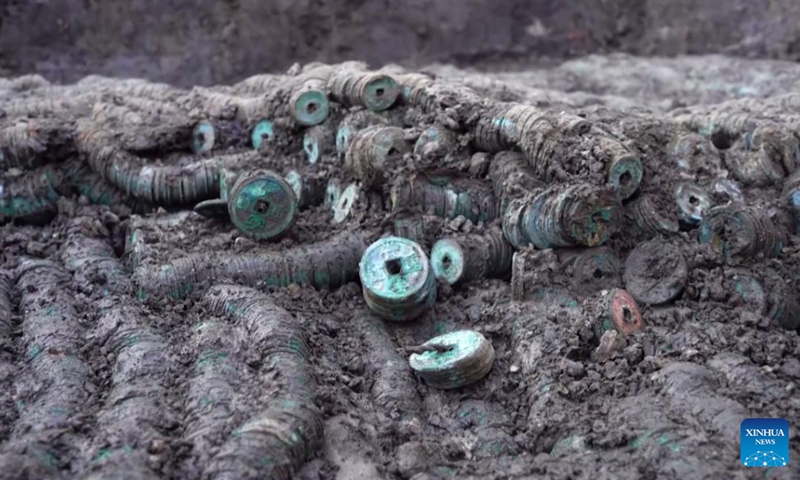 Ancient coins are unearthed in Jianhu County, Yancheng City, east China's Jiangsu Province, Oct. 23, 2022. An ancient coin hoard containing 1.5 tonnes of coins dating back to the Tang (618-907) and Song (960-1279) dynasties has been discovered in east China's Jiangsu Province.(Photo: Xinhua)