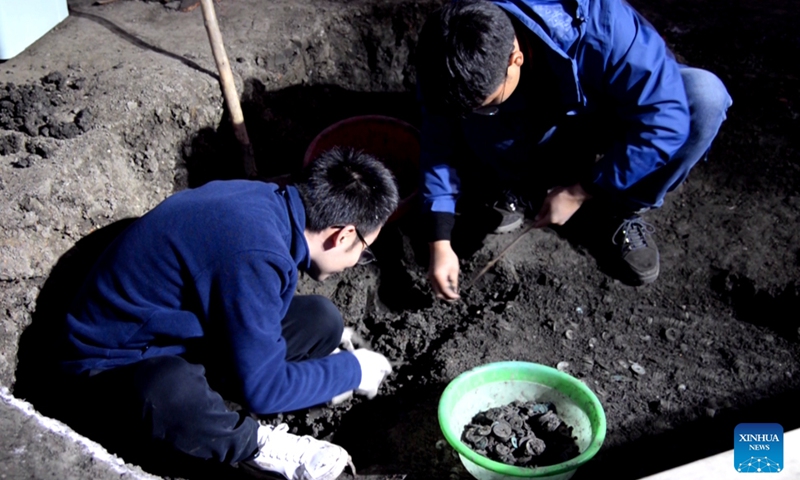 Staff members work at the archaeological site of an ancient coin hoard in Jianhu County, Yancheng City, east China's Jiangsu Province, Oct. 23, 2022. An ancient coin hoard containing 1.5 tonnes of coins dating back to the Tang (618-907) and Song (960-1279) dynasties has been discovered in east China's Jiangsu Province.(Photo: Xinhua)
