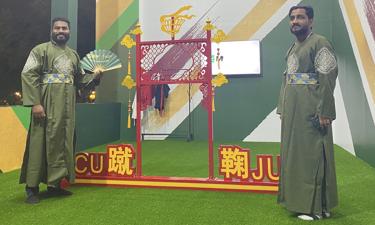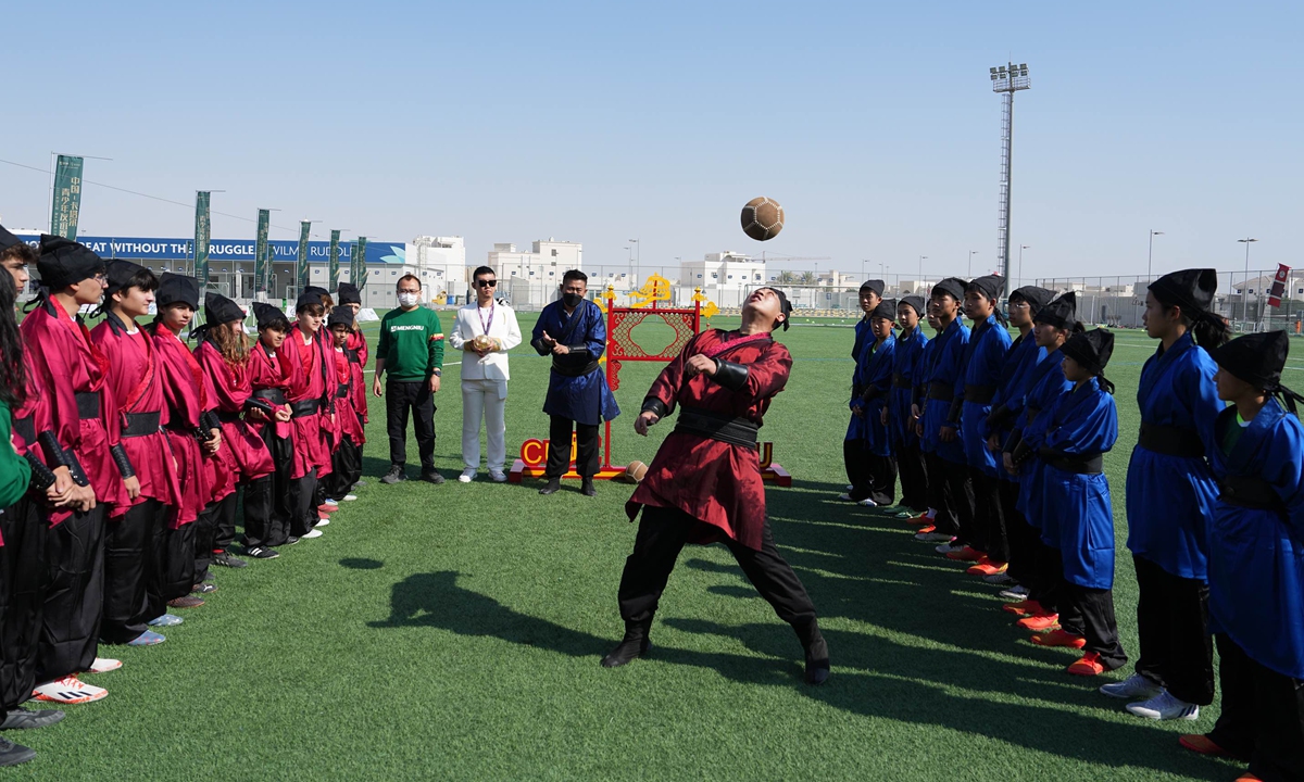 cuju and head of the cuju team in Zibo, East China's Shandong Province, the young players from China and Qatar changed into traditional Chinese cuju clothing to experience the difference between the ancient Chinese sport and modern football.