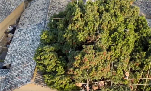 A worker pollinates cherry tomatoes and strawberries at a smart glass greenhouse in Mengcheng county, East China's Anhui Province, on December 3, 2022. Crops planted using hydroponic technology have entered the flowering and fruit-bearing period. They will be harvested for the Spring Festival, which falls on January 22 in 2023. Photo: VCG